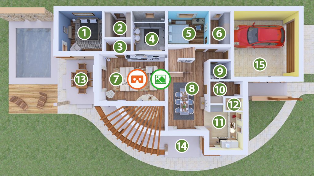 VR ikon: Tekintse meg a szoba 360 fokos látványtervét. Rendelkezik VR szemüveggel? Helyezze telefonját a szemüvegbe!